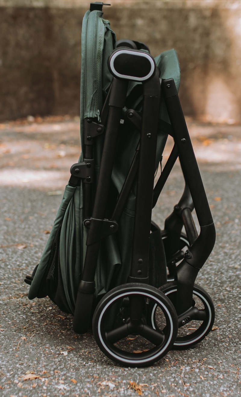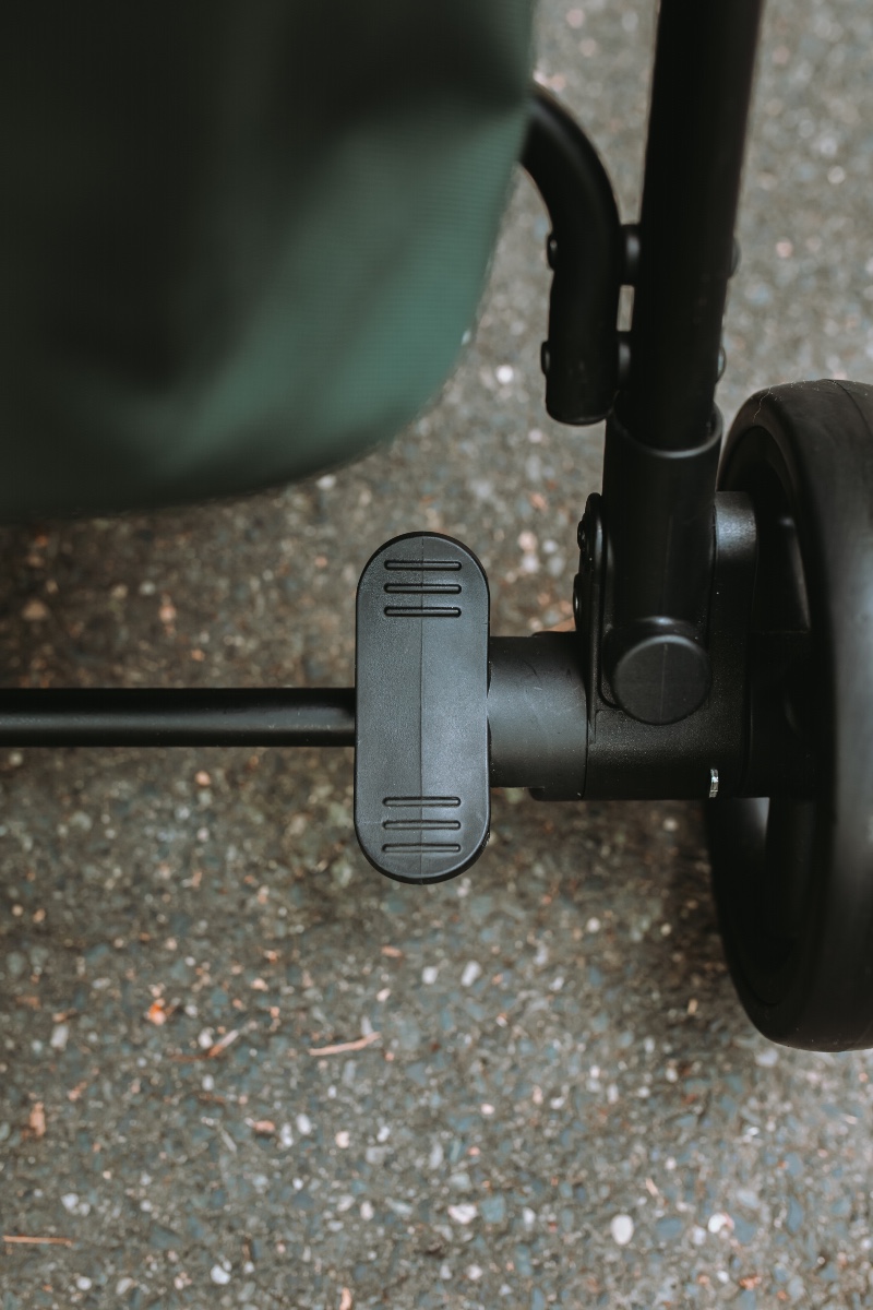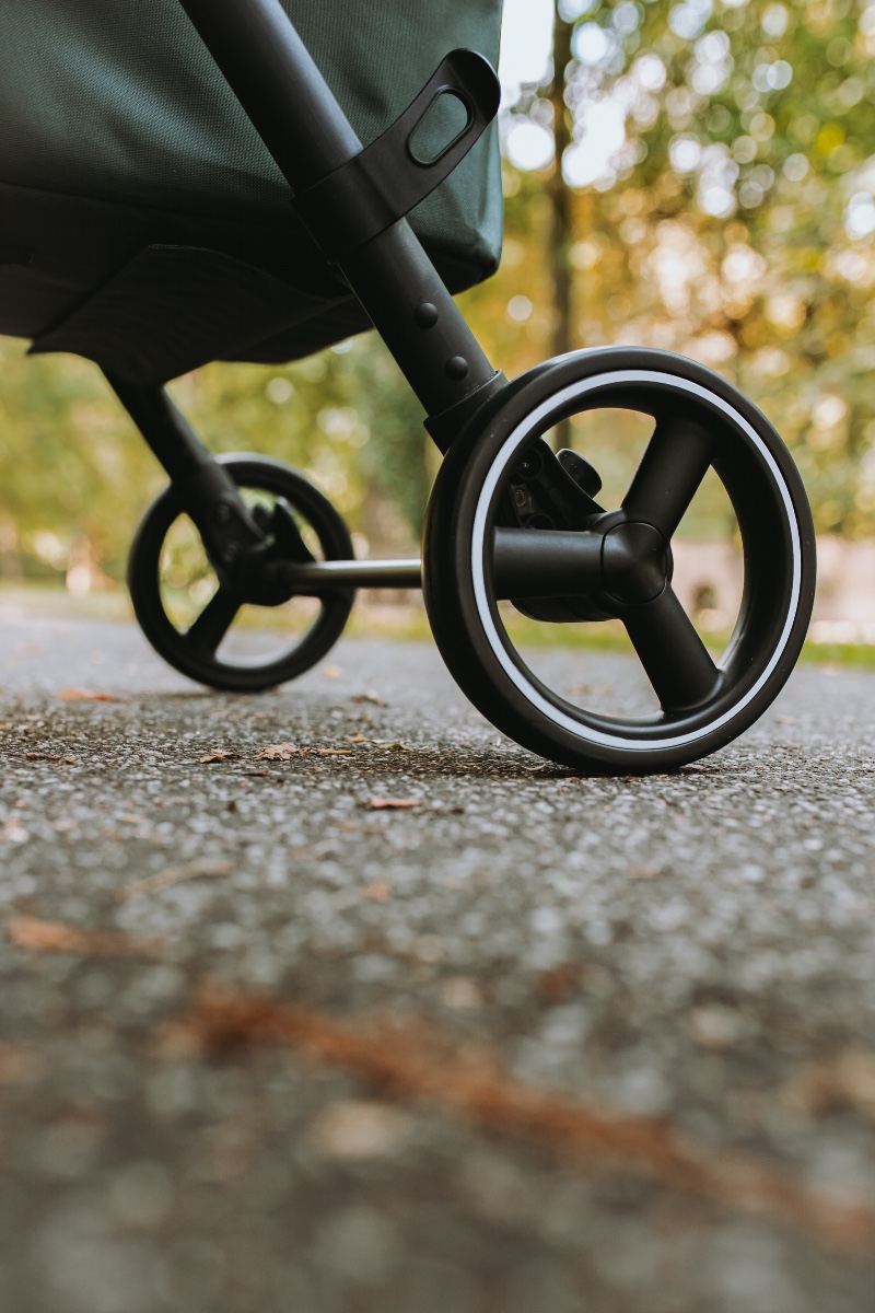 - Duże, amortyzowane koła 17/15 cm + hamulec centralny